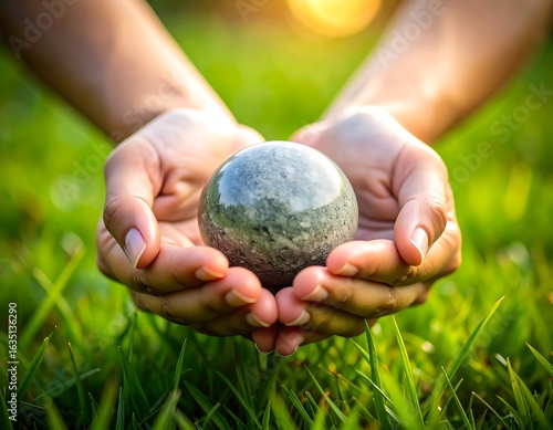 hand, sphere, grey, grass, field, nature, holding, earth, stone, smooth, green, sunlight, calm, peace, gentle, care, protect, natural, beauty, closeup, sharpened, soft, warm, light, organic, harmony, connection, environment, nurturing