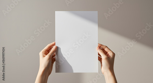 Hands holding blank white paper with shadow overlay
