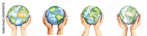 Hands holding Earth globe in watercolor style, symbolizing unity and care, isolated on transparent background.