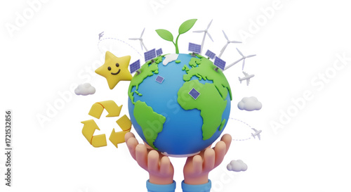 earth, globe, hand, holding, renewable energy, solar panel, recycling, star, cloud, aeroplane, sustainability, environment, ecology, green energy, clean energy, future, protection, care, nature, technology, global, planet, conservation, environmentally friendly