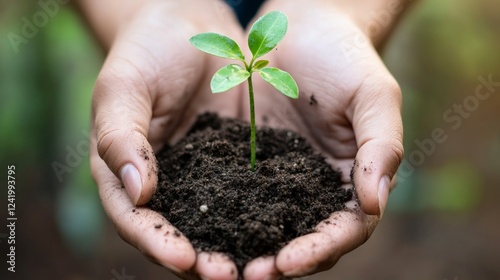Hands Holding Fresh Soil with a Young Green Plant Growing