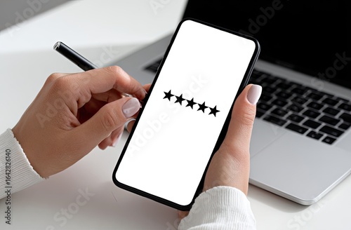 hand, phone, screen, star, rating, review, feedback, app, mobile, digital, white, black, woman, laptop, desk, office, business, work, touch, stylus, input, positive, evaluation, satisfaction, client, service, technology, product, interface, display, light, modern, device, closeup, user, interaction, comment, gesture, commentary, opinion