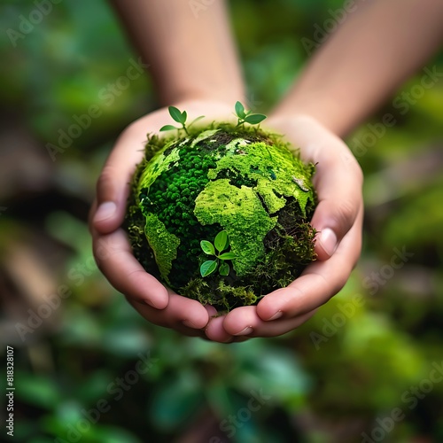 hands holding planet earth composed of vegetation