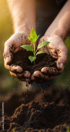 Hands holding small plant with soil in warm sunlight, symbolizing growth and care in nature, with dirt on hands showing connection to earth and nurturing environment