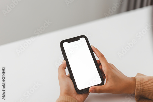 Hands holding smartphone with blank white screen, ready for customization, on a plain white background.