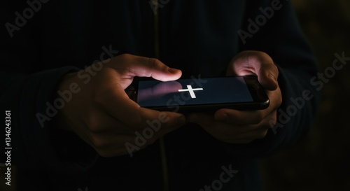 Hands Holding Smartphone with Glowing Cross - Christian Faith Illustration