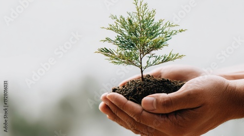 hands holding soil with a young plant, symbolizing growth and environmental care