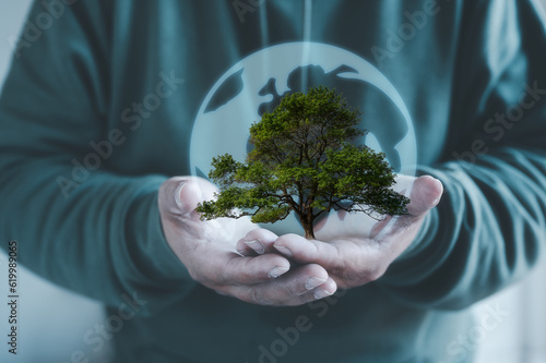 hands holding tree and virtual glob as energy efficiency concept. Renewable energy by 2050 Carbon neutral energy. Net zero carbon, earth day
