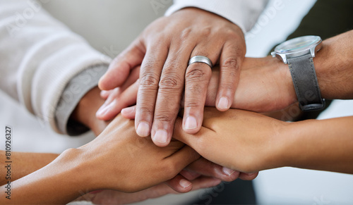 Hands, huddle and support with business people in office together closeup for solidarity or unity. Collaboration, motivation and partnership with employee team in workplace for success or target