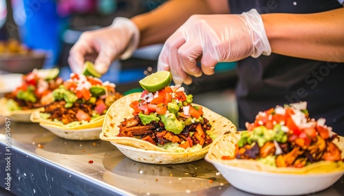 hand, glove, taco, food, topping, lime, cilantro, vegetable, eatery, chef, preparation, street, market, mexican, cookery, dish, plate, bowl, tortilla, ingredient, cooked, fresh, healthy, tasty, delicious, meal, serving, closeup, detail, picnic, colourful, mouth-watering, preparing
