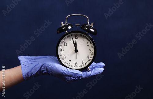 clock, glove, hand, time, safe, quarantine, pandemic, concept, alarm, corona, disease, flu, holding, hours, disease, infection, minute, protection, safety, disease, signs, virus, alarmclock, blue, classic, clinic, conceptual, deadline, help, interval, job, management, period, ticking, time management, timer, work