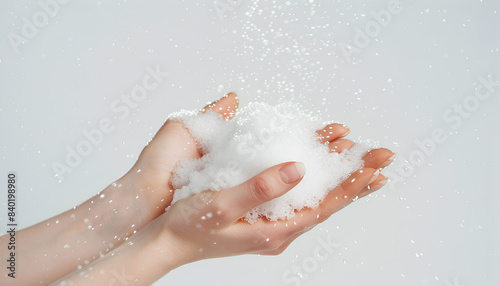 Hands in soap foam on white background
