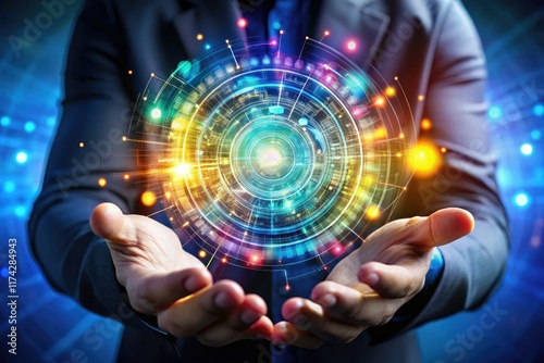hand, technology, diagram, circular, bokeh, modern, interaction, futuristic, design, light, effect, illustration, digital artwork, artificial intelligence, photorealistic, graphic design, abstract, circle, pattern, bright, vibrant, realistic, smooth, clean, interactive, touch screen, interface, datum, circuit, chips, progress, innovation, future, concept, image, photo, creative, art