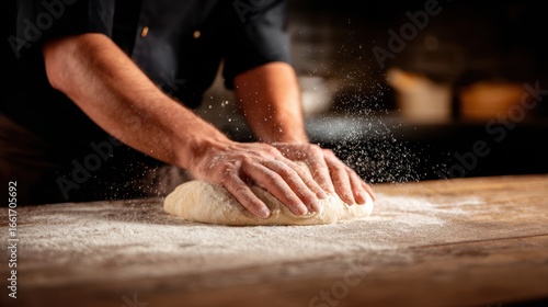 Hands kneading dough on a wooden table in a rustic kitchen with flour dust in the air
