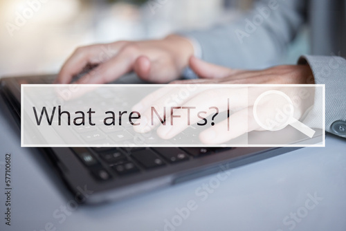 Hands, laptop and cryptocurrency NFT search bar for trading or investing on stock market at office. Hand of employee browsing on computer for online research, blockchain or data on virtual platform