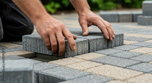 paving, stone, patio, paseo, construction, hand, laying, brick, building, surface, grey, beige, pattern, texture, landscaping, labor, bricolage, renovation, repair, garden, backyard, craftsman, men at work, concrete, cobbled, block, material, installation, project, ground, exterior, design, architecture