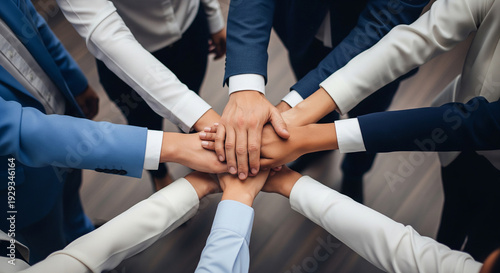 Hands of a diverse corporate team stacked together in the center perfect for professional unity teamwork and collaboration