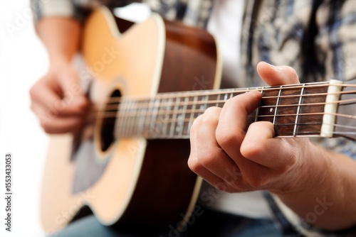 guitar, acoustic, music, instrument, string, playing, hand, closeup, musician, finger, chord, guitarist, wood, sound, melody, song, musical, performance, art, lifestyle, hobby, creative, talent, relaxation, practice, session, concert, blues, country, folk, rock, pop, artist, tune, harmony, composition, entertainment, passion, craft, texture, detail, light, sharpened, isolated, white background