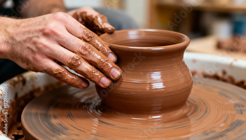 potter, pottery, clay, hand, wheel, craft, ceramic, hand-made, shaping, art, workshop, craftsman, artisan, hobby, creation, earthenware, form, skill, process, wet, dirty, closeup, detail, leisure, therapy, man, male, person, traditional, sculpture, making, work, create, design, molding, throwing, turning, brown, human, finger, rotate, spin, motion, culture, passion