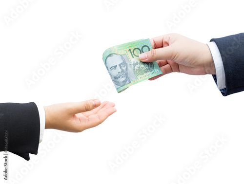 Hands of businessman passing Australian dollar (AUD) banknote on isolated background.