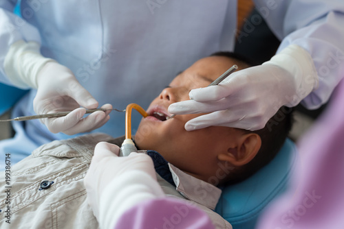 Hands of dentist holding a dental tool. Checking the teeth to the boy lying in the dental chair in a hospital.