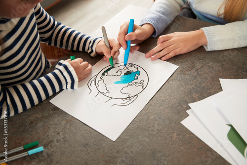 hand, girl, colouring, planet, earth, pen, home, family, ecology, sustainability, copy space, 2, people, children, elementary, preteen, midsection, interior, sibling, responsibility, felt, tip, creativity, orb, universe, logotype, symbol, save, phrase, english, text, writing, england, teamwork, team, activism, pair, table, sister, togetherness, caucasian, bonding, lifestyle, paper, drawing, picture, recycling, female