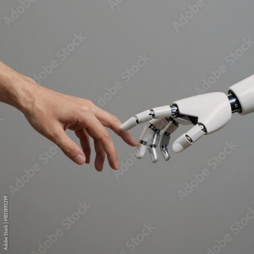 artificial intelligence, advanced technology, cybernetic, synthetic, bionic, coexistence, future, futuristic, progressive, engineering, high technology, science fiction, grey background, fingernail, realistic, finger