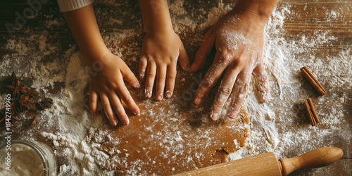 baking, family, hand, children, eltern, dough, flour, cooking, preparing, holiday, homemade, tradition, teamwork, learning, togetherness, christmas, cookie, kitchen, happy, childhood, food, dessert, gingerbread, top, view, ingredient, star, anise, cinnamon, stick, rolling, pin, wooden, table, bonding, fun, winter, festive, sweet, making, pastry, flat, lay, generation, teaching