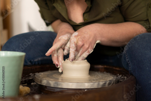hand, woman, pot, clay, pottery, wheel, workshop, copy space, 1, people, adult, day, midsection, craft, ceramic, expertise, art, creativity, creative, professional, producing, earthenware, molding, shape, casual attire, sitting, motion, mid, caucasian, skill, artist, mud, nature, shaping, russia, female