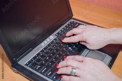 Hands of woman wearing smartwatch on the keyboard of her laptop