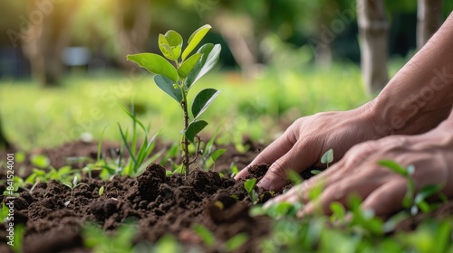Hands planting a tree sapling in a green field, symbolizing conservation efforts and environmental stewardship