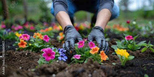 gardening, planting, flower, dirtied, hand, glove, colourful, garden, spring, nature, horticulture, floral, greenery, landscaping, vibrant, garden tool, sunlit, flowerbed, agriculture, garden design, pollination, sowing, nurturing, blossom, botanical, ecological, sunshine, garden maintenance, earth, seed, landscape design