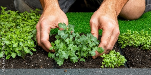 Hands Planting Greenery on a Green Roof Sustainable Urban Gardening
