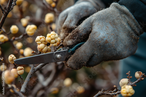 Hands pruning fruit tree branches in a spring garden, preparing trees for new growth under soft sunlight.