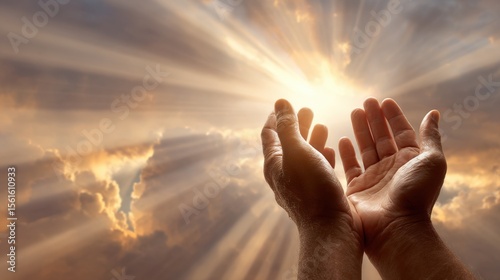 Hands Reaching Towards the Bright Sun with Radiant Sunbeams and Cloudy Sky.