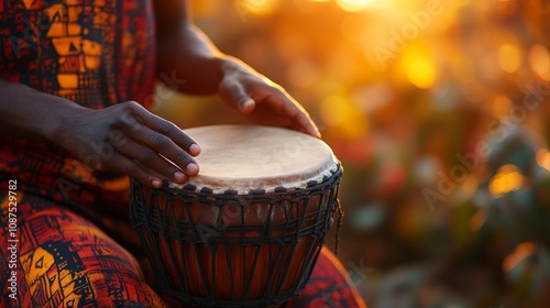 Hands rhythmically playing a traditional djembe drum amidst a vibrant sunset, capturing cultural expression and musical harmony.