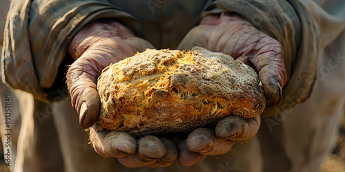Hands That Feed Us: A pair of calloused, yet strong-looking hands holding a piece of farm-fresh bread.