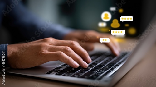 Hands typing on a laptop with floating chat icons symbolizing digital communication.