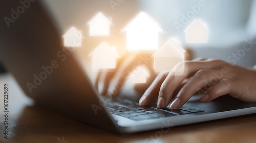 Hands typing on a laptop with glowing upward arrows symbolizing growth