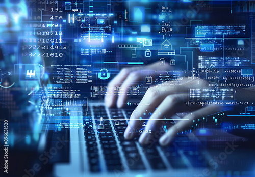 Hands Typing on Laptop with Futuristic Digital Interface and Cybersecurity Icons