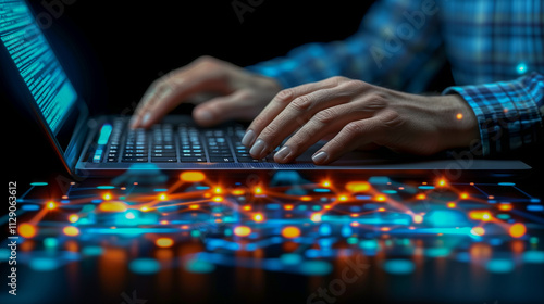 Hands Typing on Laptop with Glowing Data Network Overlay..