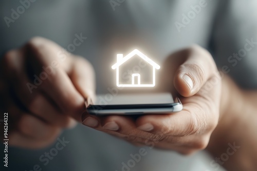 Hands using smartphone with glowing house icon - online real estate, tech innovation