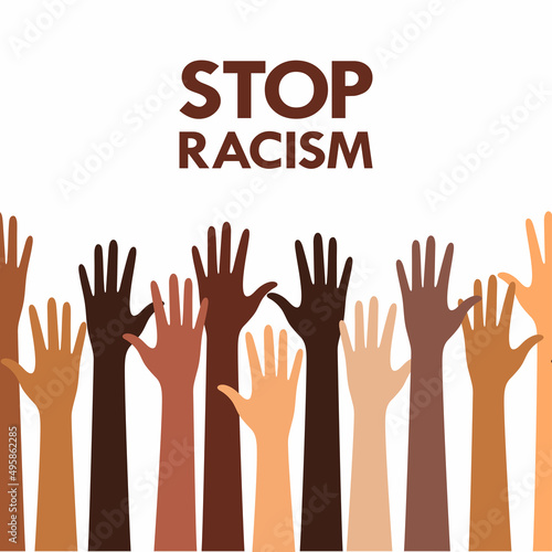 Hands with different skin tones on the background of the inscription stop racism social equality.