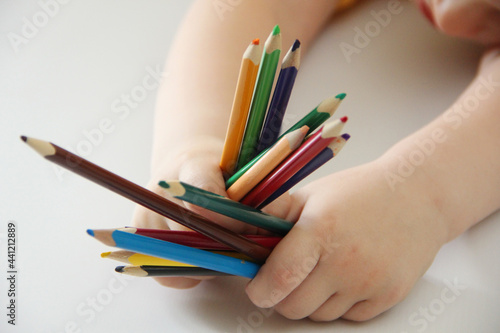 hands with pencils. The child is holding a lot of colorful pencils for drawing.