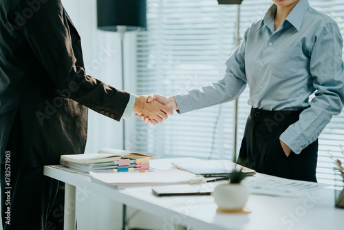 Handshake Agreement: Two professionals seal a deal with a firm handshake at the office desk, in the presence of natural daylight. Capturing trust and cooperation