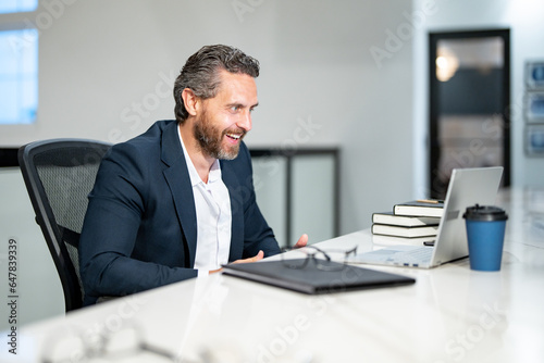 Handsome 40s business man working with laptop in office. Gray hair mature business man director using laptop. Millennial manager at office workplace. Ceo office workers business people at office.