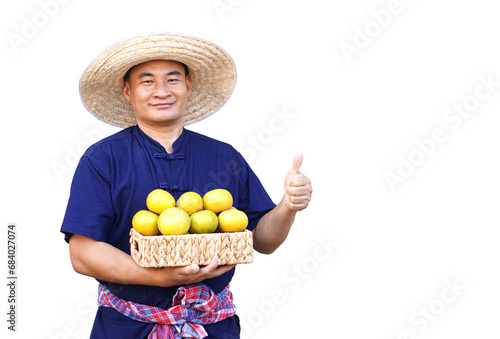 farmer, adult, advertisement, agricultural, agriculture, agronomist, asia, asian, background, basket, business, cheerful, concept, confident, crop, crop, export, expression, face, fruit, gardener, gesture, hand, photogenic, happy, harvest, hat, hold, isolated, local, loincloth, male, man, market, occupation, orange, orange, organic, people, person, present, produce, show, smile, thai
