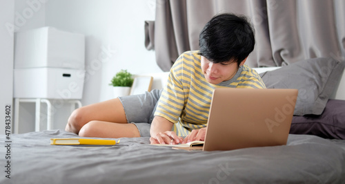 Handsome asian man lying on comfortable bed and using laptop computer.