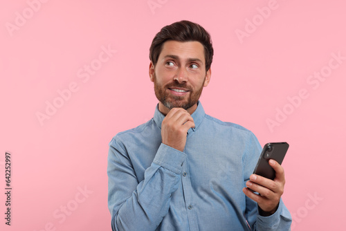 adult, app, application, background, bearded, browse, business, caucasian, mobile phone, mobile phone, chatting, communication, contact, device, digital, dreaming, electronic, contraption, photogenic, happy, holding, cyberspace, lifestyle, male, man, media, message, mobile, model, modern, online, pensive, person, phone, pink, portable, portrait, smartphone, smiling, social, studio, surfing, technology, phone, texting, thinking, touch, using, video