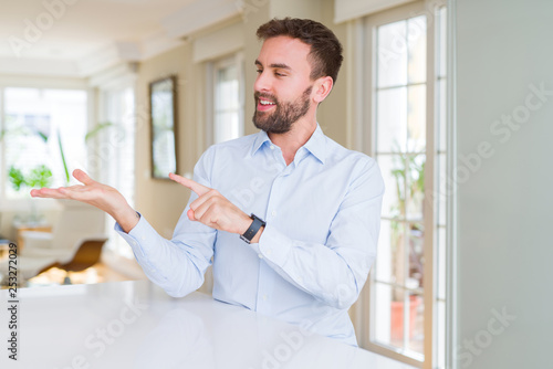Handsome business man amazed and smiling to the camera while presenting with hand and pointing with finger.